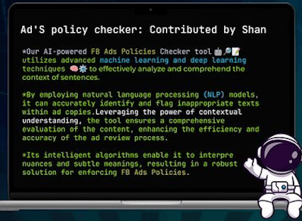 Working with Shan and his team has been an exceptional experience. The development of the FB Ads Policy Checker tool has significantly streamlined our ad review process, reducing manual review hours by 50%. His dedication to understanding our needs and delivering a tailored solution has solidified our partnership.